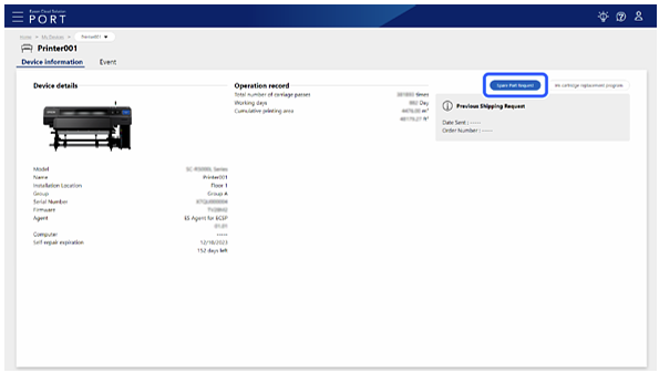 - The Spare Part Request button is not displayed for printers that do not allow customers to replace parts themselves. The status of the previous request is displayed below the button.